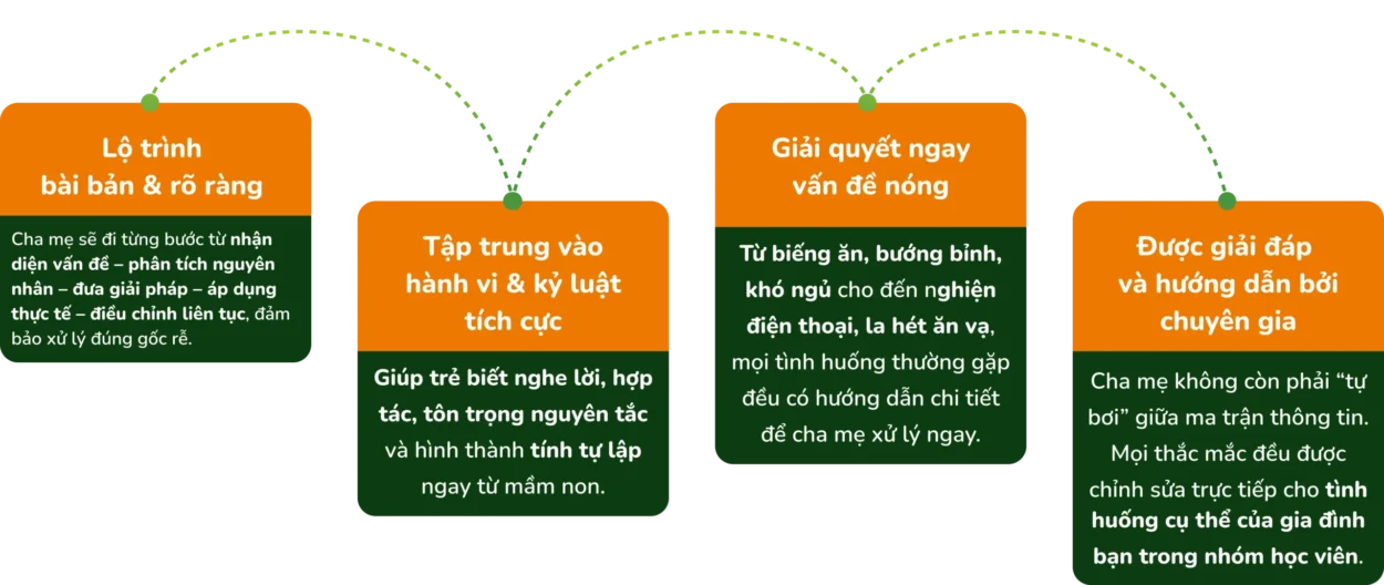 Điểm khác biệt lớn nhất: bạn được tham gia nhóm học viên, tại đó chuyên gia giúp chỉnh ngay tình huống cụ thể của gia đình, để phương pháp thực sự hiệu quả.